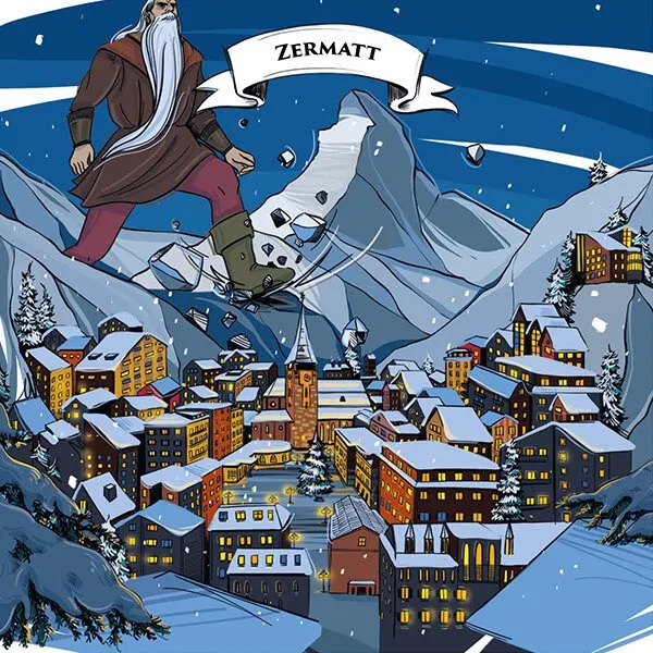 Zermatt DER RIESE GARGANTUA Die charakteristische Gestalt des Matterhorns ist Jahrtausende alt. Zu verdanken ist sie einem Riesen, den die Neugier in die Schweiz zog… Jedes Kind kennt das Matterhorn: Es gehört nicht nur zu einem der höchsten Bergen der Alpen, sondern ist auch das Wahrzeichen der Schweiz überhaupt. Mundartlich wird es daher liebevoll „ds Hore“ oder „ds Horu“ (das Horn) genannt. Weltberühmt ist vor allem der schneebedeckte Gipfel, der wie eine Pyramide in den Himmel ragt; und jedes Jahr versuchen sich mehrere tausend Bergsteiger an seinem alpinen Aufstieg. Wie genau jedoch das Matterhorn entstanden ist, davon erzählt die Sage des Riesen Gargantua. Vor vielen Jahrtausenden lebte der Riese Gargantua in den Alpen. Gewaltig war seine Gestalt; wenn er sich aufragte, berührte er fast die Wolken. Sein Kopf war so gross wie ein wuchtiger Felsbrocken, seine Hände kräftige Pranken, die einen Baumstamm wie ein Streichholz zerbrechen konnten. Die Ohren und Nasenlöcher des Riesen glichen finsteren Höhlen, in denen leicht ein Kind hätte Platz finden können. Wenn Gargantua seinen massigen Körper bewegte, erzitterte die Erde, und seine stampfenden Schritte hinterliessen tiefe Spuren. Wo sich der Riese zum Ausruhen hinlegte, dort blieb ein deutlicher Abdruck zurück. Gargantua konnte sich mit seinem massigen Körper nicht allzu geschickt bewegen, und nicht selten wies eine Schneise der Verwüstung darauf hin, wo der Riese vorbeigekommen war. Dennoch war er den Menschen wohlgesonnen, und nicht ohne Neugier. Nun war das Matterhorn zur jener Zeit noch eine massive Bergwand, die einheitlich hoch war und so das sonnige Tal bei Valtournenche gegen den kalten Nordwind abschirmte. Gargantua, der im italienischen Aostatal weilte, wollte jedoch einmal wissen, was sich hinter dieser massiven Bergkette verbarg. Mit einem grossen Schritt stieg er über die Felswand und war so schon mit einem Fuss in der Schweiz, bis nach Zermatt reichte der Schritt. Als er jedoch seinen anderen Fuss nachziehen wollte, oh weh! Da brachte er das Gebirge ringsum zum Einsturz. Nur jene Felsen, die sich zwischen den Beinen des Riesen befunden hatten, blieben stehen. So stellen sie das heutige Matterhorn dar. Teilen Sie diese Legende FINDEN SIE MEHR ÜBER ANDERE LEGENDEN HERAUS Alle unsere Legenden BASEL BERN GENF LUZERN ZÜRICH SCHWEIZ Sie mögen Zermatt? Finden Sie es auf all diesen legendären Produkten Legendenbox limited edition: set 2 2018-10-19 Legendenbox classic: set 2 2018-10-19 Zermatt Notizbücher 2018-10-08 Zermatt postkarten 2018-10-07